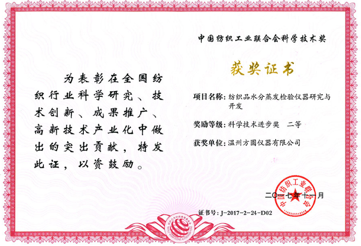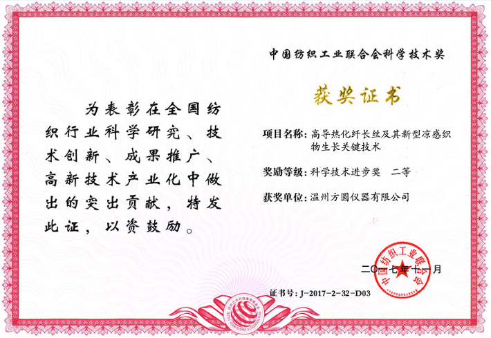 近日,在由中國紡織工業聯合會主辦、紡織之光科技教育基金會協辦的“紡織之光”2017年度中國紡織工業聯合會科技教育獎勵大會上,溫州方圓儀器有限公司參評的“紡織品水分蒸發檢驗儀器研究與開發”、“高導熱化纖長絲及其新型涼感織物生產關鍵技術”雙雙榮獲“科學技術進步獎二等獎”。